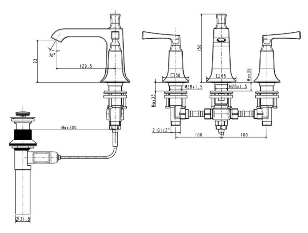 - Kiểu vòi: vòi lavabo 3 lỗ 1 cần gạt nóng lạnh