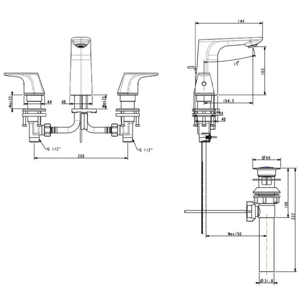 - Kiểu vòi: Vòi lavabo 3 lỗ 2 cần gạt nóng lạnh
