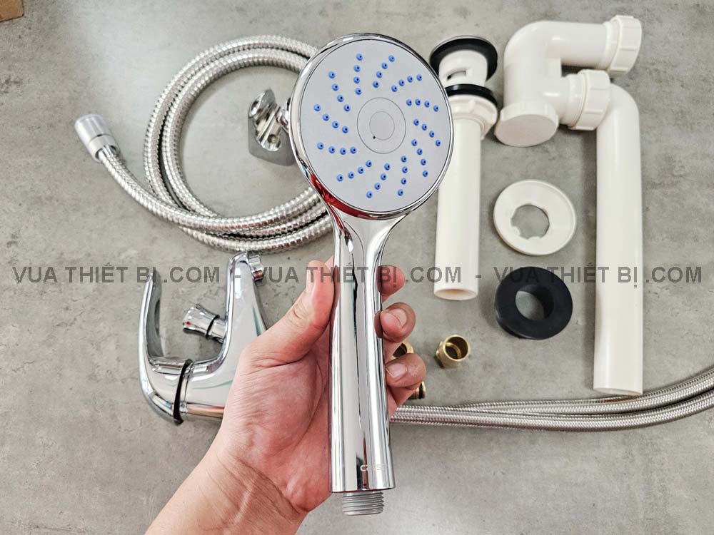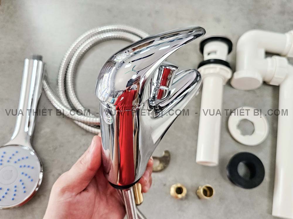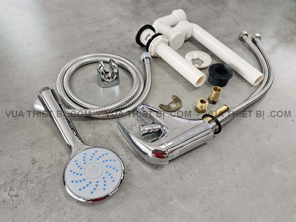 - Bao gồm: thân vòi, ống xả nhấn / ty, siphon chữ P, dây cấp nóng lạnh, dây sen và tay sen và gác sen