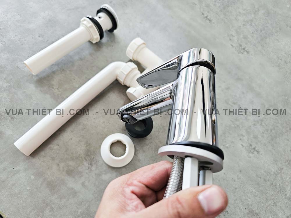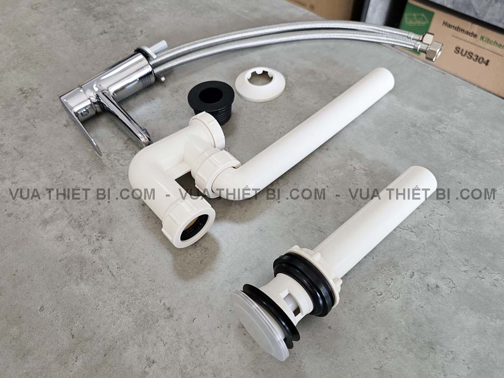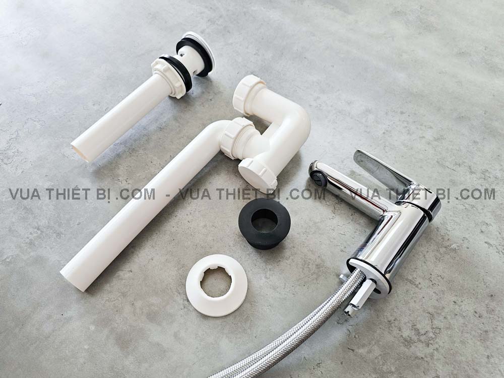 - Bao gồm: thân vòi, ống xả nhấn / ty, siphon chữ P, dây cấp nóng lạnh