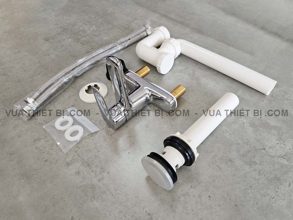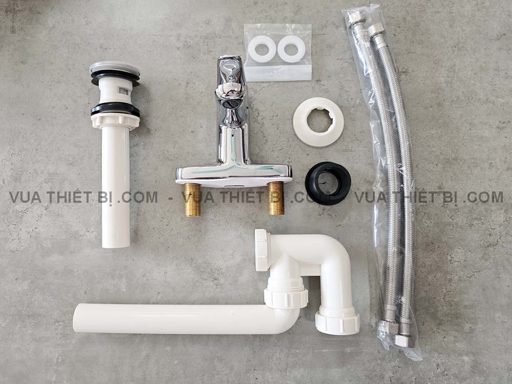 - Bao gồm: thân vòi, ống xả nhấn / ty, siphon chữ P, dây cấp nóng lạnh
