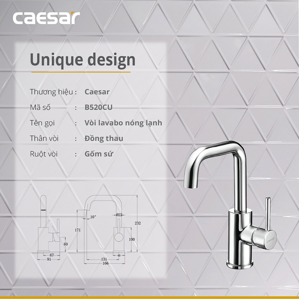 Thông số kĩ thuật Vòi lavabo CAESAR B520CU cổ cao nóng lạnh