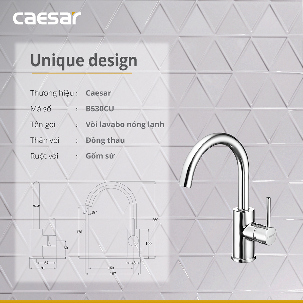 Thông số kĩ thuật Vòi lavabo CAESAR B530CU cổ cao nóng lạnh