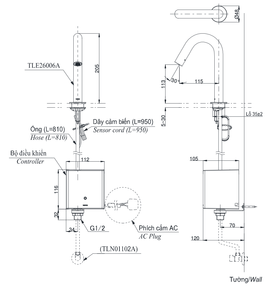 Bản vẽ kỹ thuật Vòi lavabo TOTO TLE26006A cảm ứng gắn bàn/chậu