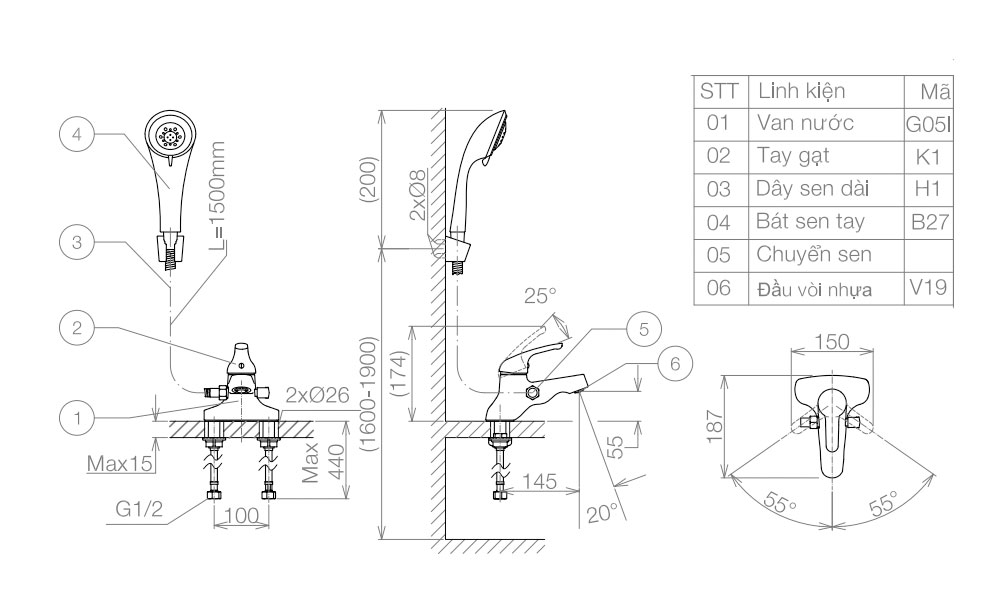 Bản vẽ kỹ thuật Vòi lavabo VIGLACERA VG326 kèm sen tắm nóng lạnh