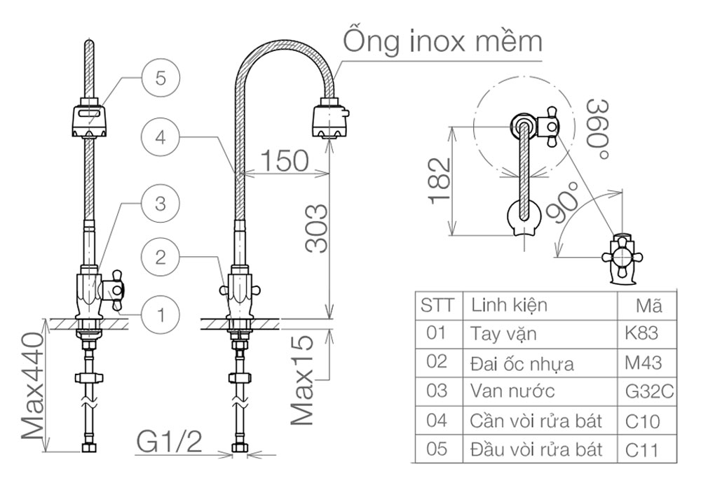 - Thân vòi xoay 180 độ, cổ vòi uốn cong linh hoạt