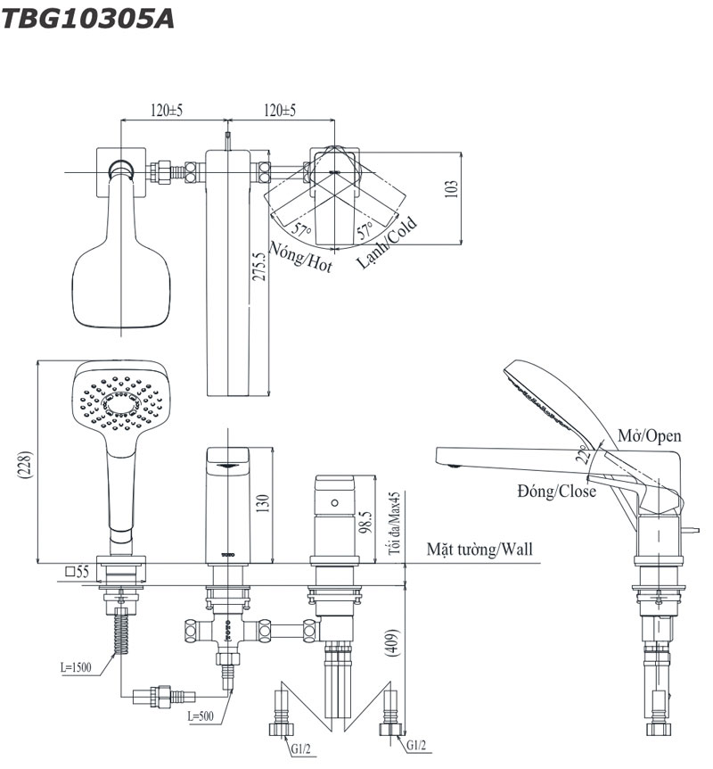 Thông số kỹ thuật Vòi sen bồn tắm TOTO TBG10305AA gắn bồn 3 lỗ