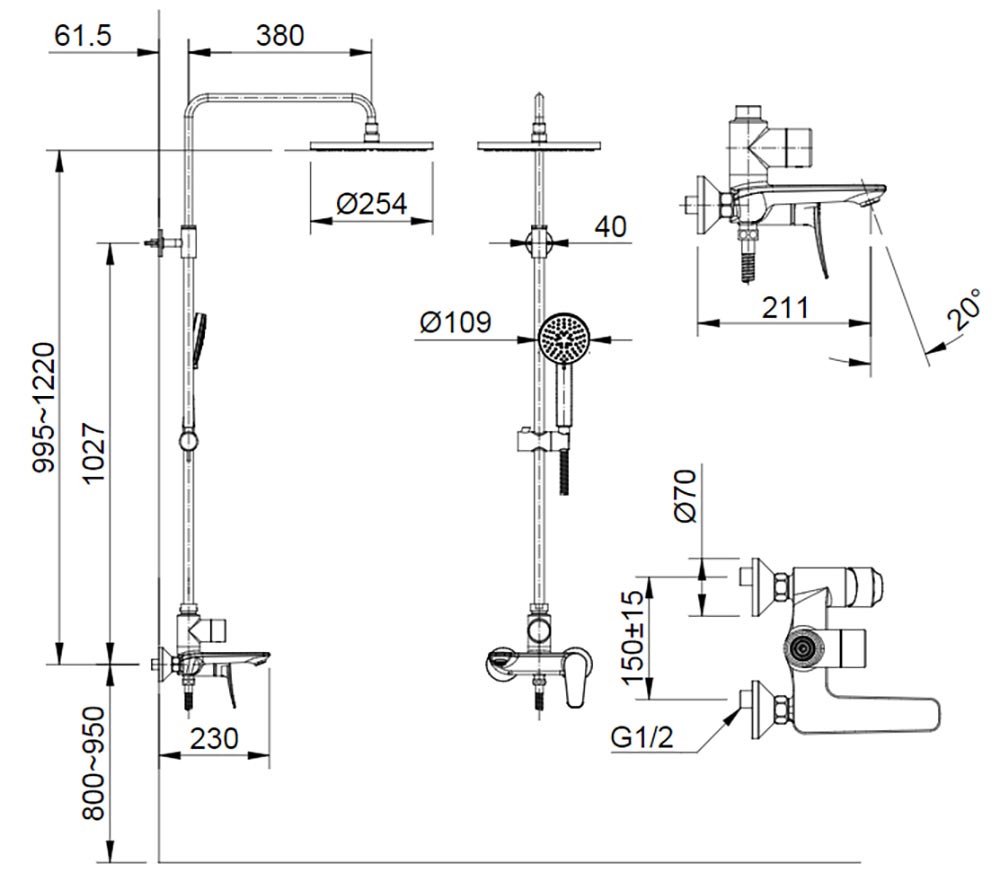 Bản vẽ kỹ thuật Vòi sen cây INAX BFV-515S nóng lạnh