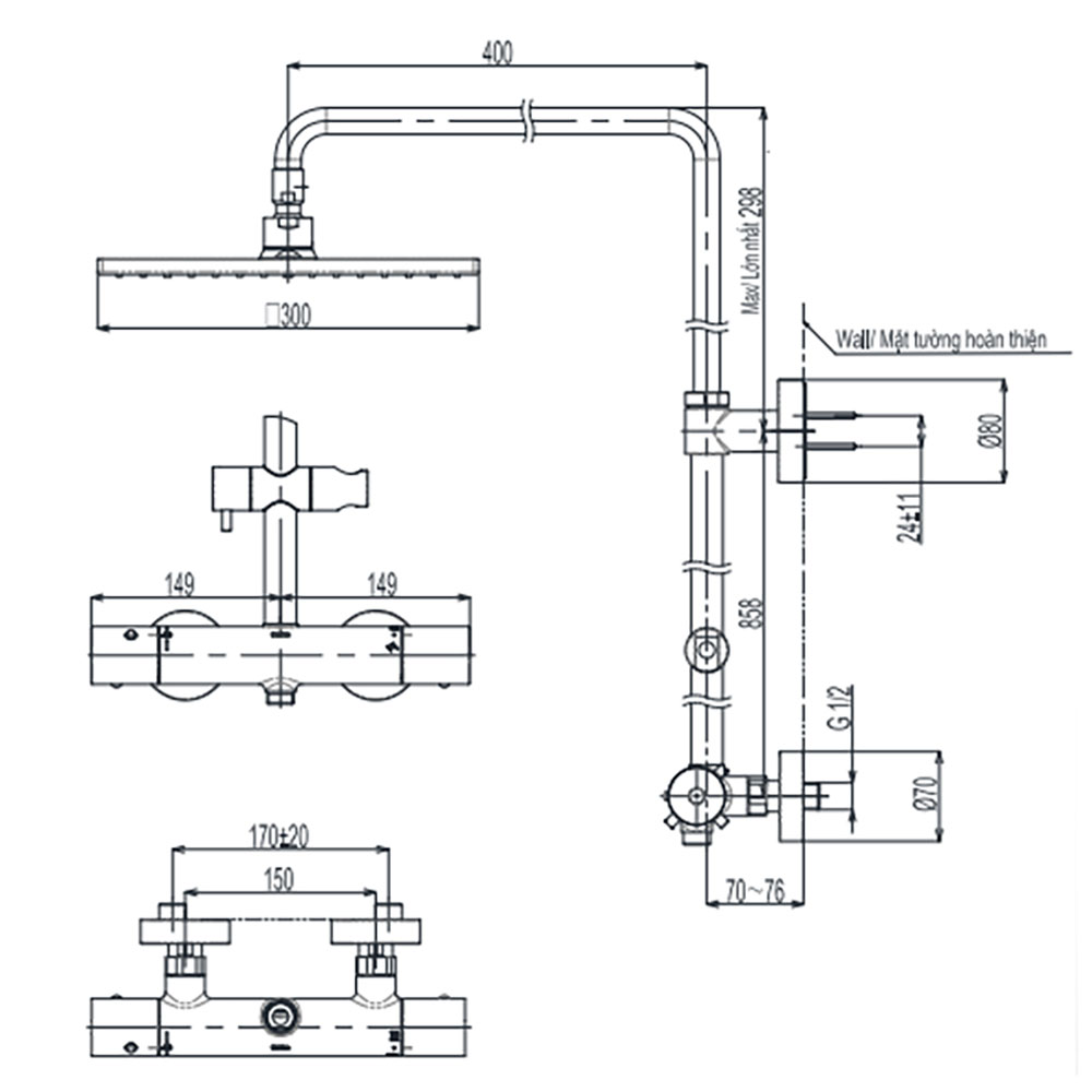 Bản vẽ kỹ thuật Vòi sen cây TOTO TBW08406A nhiệt độ