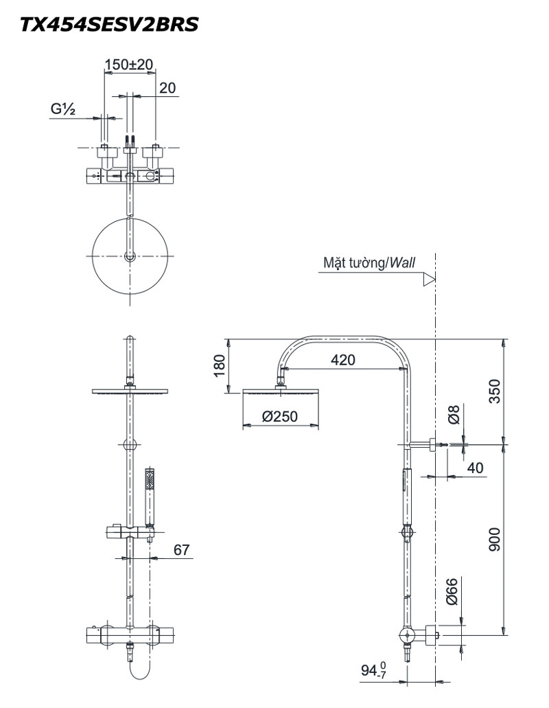 Bản vẽ kỹ thuật Vòi sen cây TOTO TX454SESV2 BRS nhiệt độ