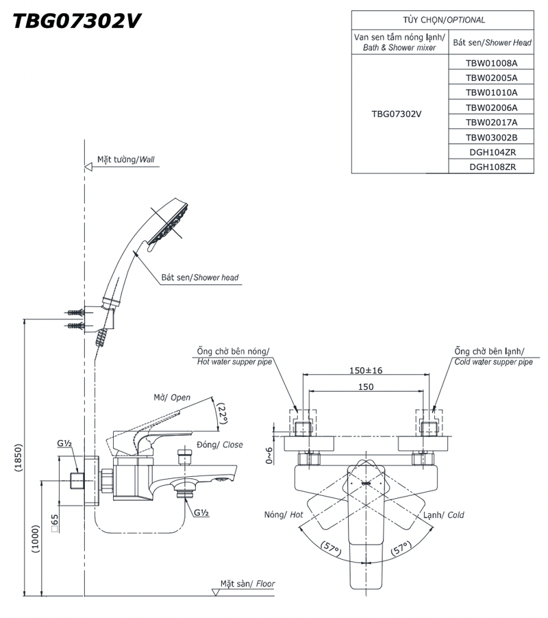 Bản vẽ kỹ thuật Vòi sen tắm TOTO TBG07302VA nóng lạnh