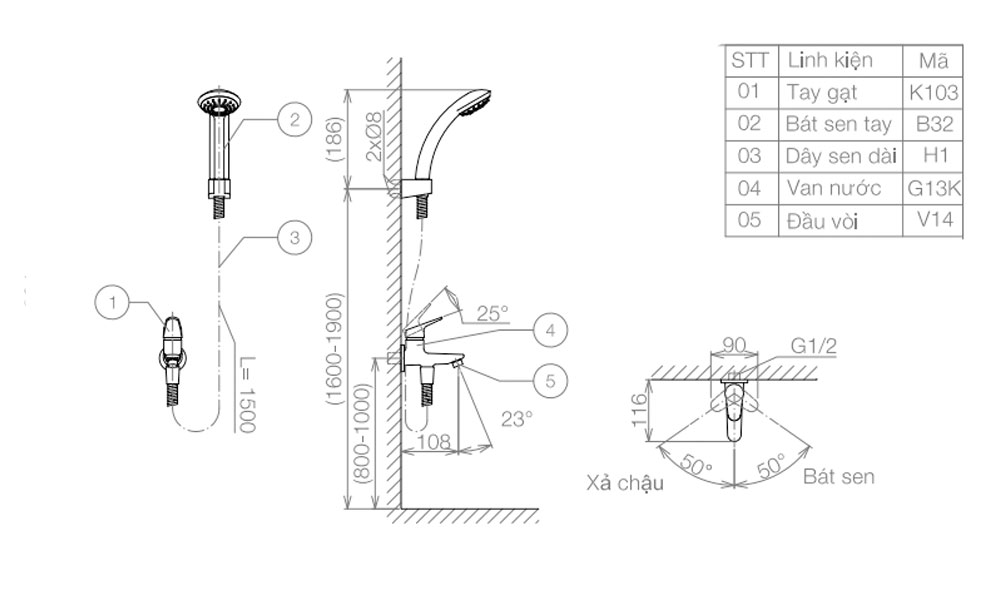 Bản vẽ kỹ thuật Vòi sen tắm VIGLACERA VG503 chỉ lạnh