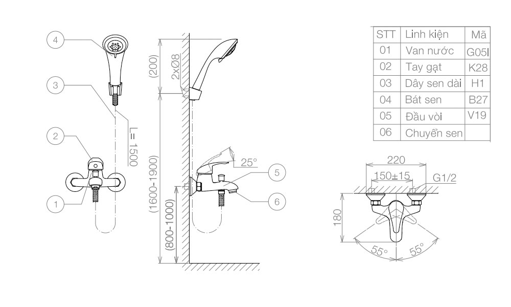 Bản vẽ kỹ thuật Vòi sen tắm VIGLACERA VG504 nóng lạnh