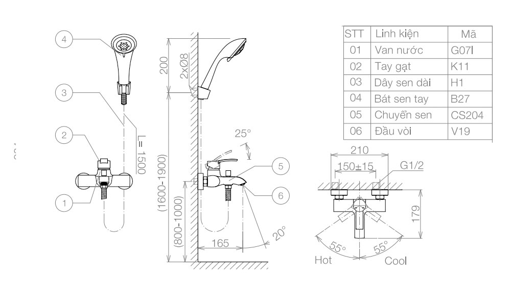 Bản vẽ kỹ thuật Vòi sen tắm VIGLACERA nóng lạnh